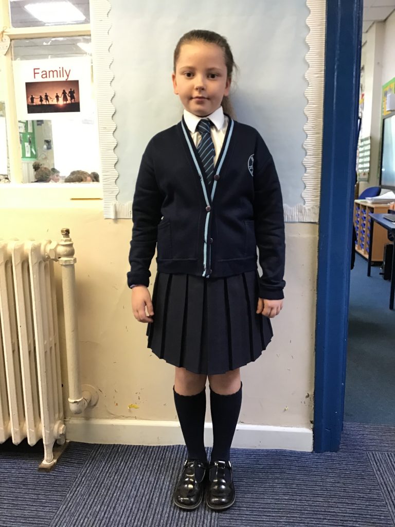 Year 4 student wearing a white blouse and school tie with a navy skirt and navy cardigan.