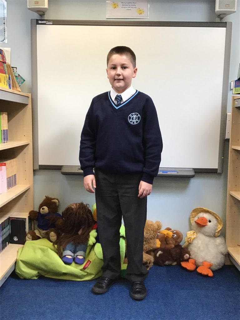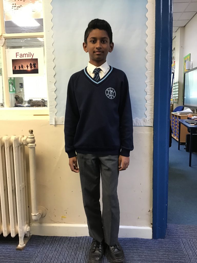 Year 4 Student wearing a white shirt and school tie with grey trousers and a navy jumper.